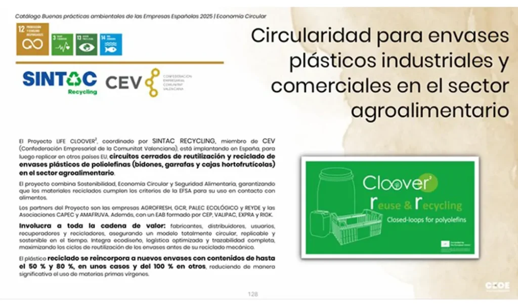 The LIFE CLOOVER² project has been included in the 2025 Catalogue of Good Environmental Practices published by the Spanish Confederation of Business Organisations (CEOE). The catalogue has been developed by the organisation’s Department of Industry, Energy, Environment and Climate and highlights initiatives that promote sustainability and environmental responsibility within the business sector.
